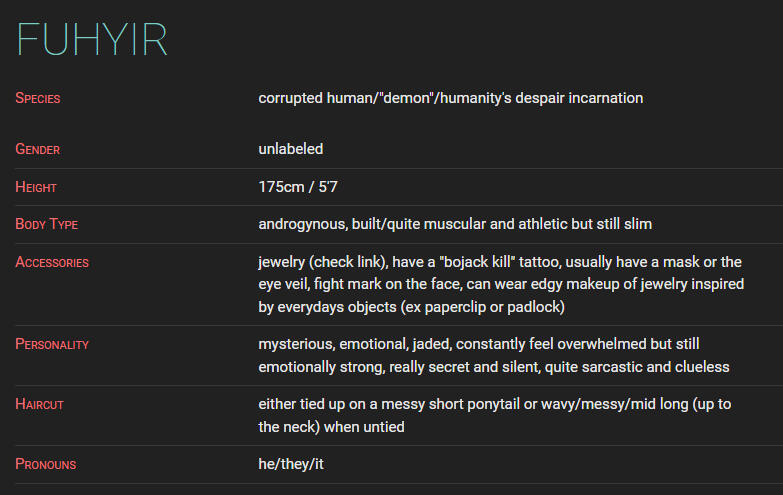 "Fuhyir was an unlucky human with a terrible life. On the verge of taking his own life, a spirit (hiding one of the most terrible demons in existence) proposed a pact: if he agreed to take all the misfortunes of the world into himself for a few seconds only, he would change the world while living the best life possible. But of course, Fuhyir did not survive and his soul was corrupted by all the misery and cruelty that humans gave off. He now wanders, half hating the world, the other half trying to escape every corner of the trauma he carries within, as if he himself had become a carrier of evil incarnate. He became the curse that was eating away at him, overestimating his strength and forging himself in his own tears. It became the embodiment of all the traumas of every being. He then enlists as a mercenary, hoping to find a way to extinguish the growing hatred within him forever."